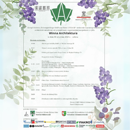 W dniu 6 września weźmiemy udział w wydarzeniu „Winna Architektura”, organizowanym przez Stowarzyszenie Architektów Polskich O/Zielona Góra w ramach Dni Miasta Zielona Góra – Winobrania.