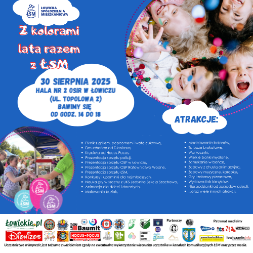 30 sierpnia 2025 r. zapraszamy na barwną zabawę w ramach pikniku „Z kolorami lata razem z ŁSM”, który odbędzie się w hali nr 2 OSiR w Łowiczu (ul. Topolowa 2) w godz. 14:00–18:00.