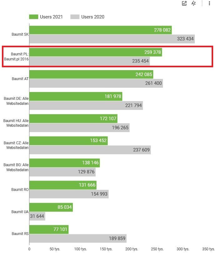 Udostępniamy raport internetowy za 2021 rok. Po uwzględnieniu w nim 30% użytkowników, którzy nie akceptują plików cookies zauważyliśmy wzrost odwiedzin o około 8% w porównaniu z rokiem 2020. Najczęściej klikalną stroną Baumit w tym roku była witryna Słowacji, na drugiej pozycji uplasowała się Polska, a tuż za nią Austria.