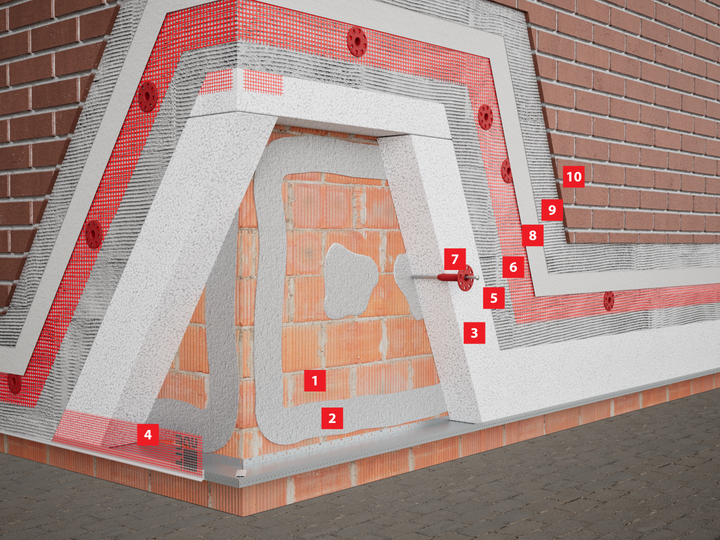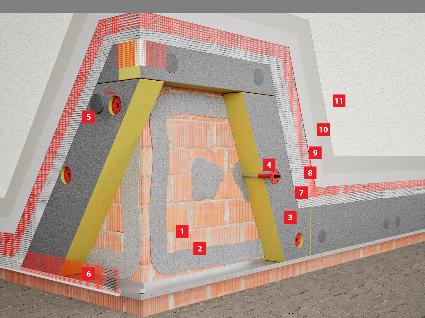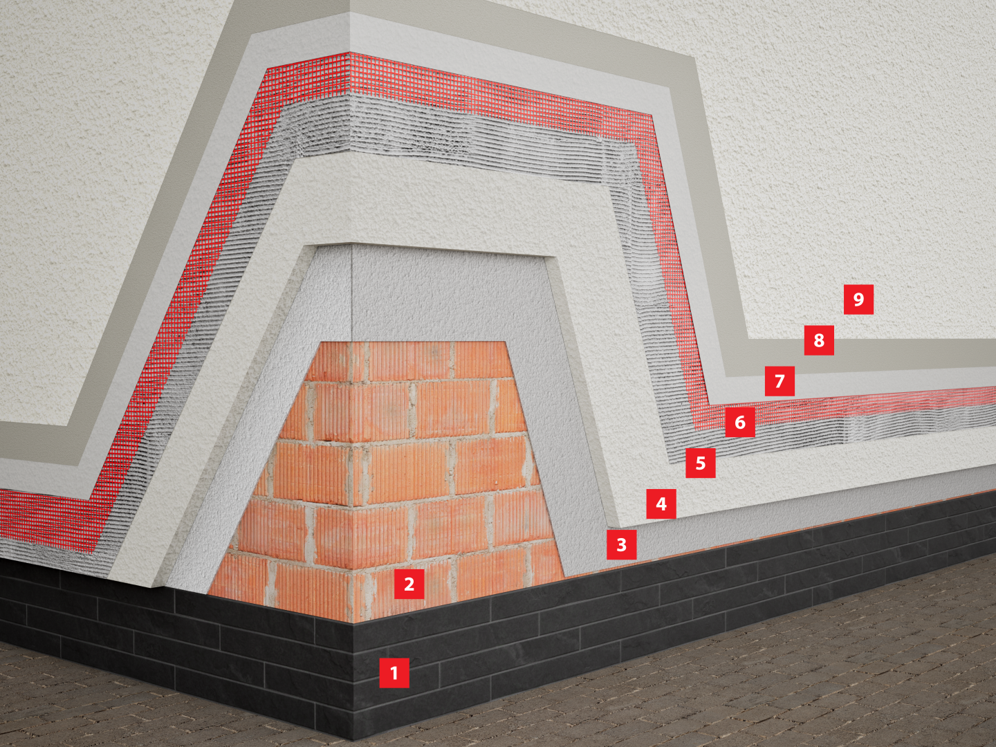 7. biała, wysokoelastyczna zaprawa klejowo-szpachlowa Baumit StarContact White / elastyczna zaprawa klejowo-szpachlowa Baumit ProContact/ biała szpachla scalająca, wewnętrznie zbrojona, do zatapiania siatki Baumit MultiContact MC55 W (cienka warstwa, na grzebień)
