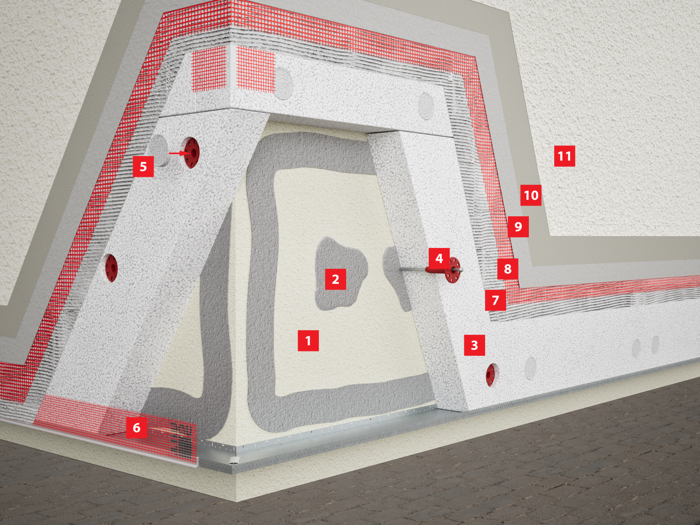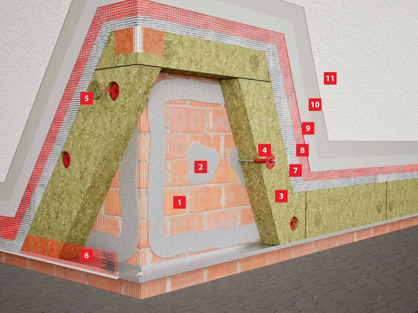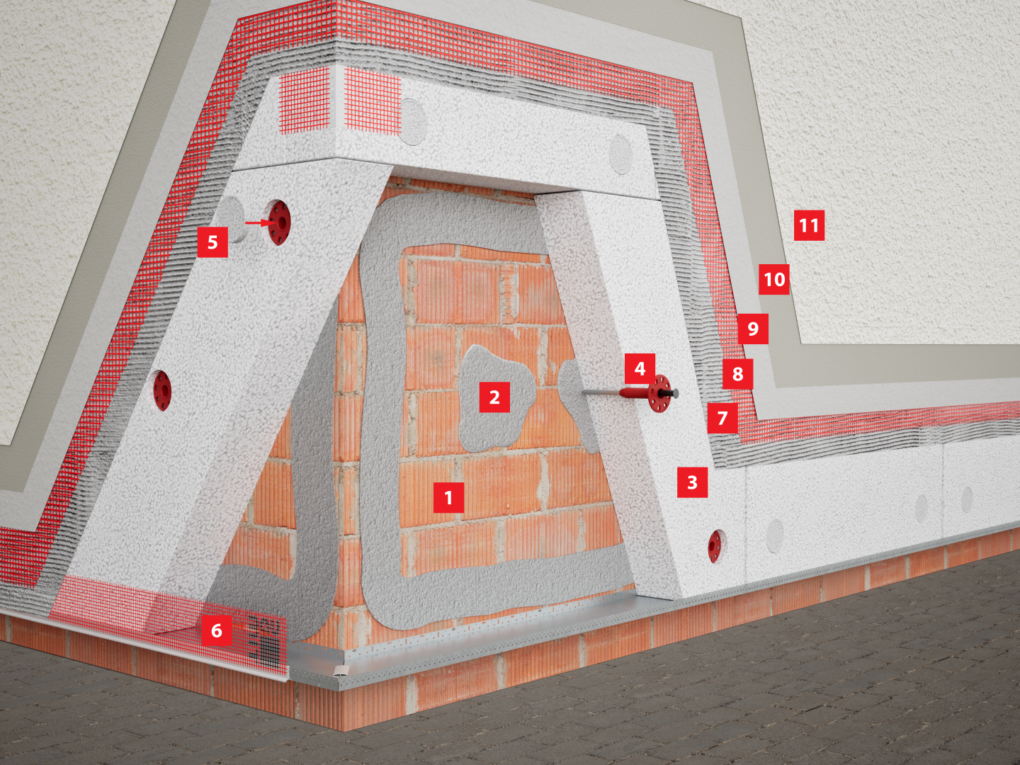 7. biała, wysokoelastyczna zaprawa klejowo-szpachlowa Baumit StarContact White / elastyczna zaprawa klejowo-szpachlowa Baumit ProContact/ biała szpachla scalająca, wewnętrznie zbrojona, do zatapiania siatki Baumit MultiContact MC55 W (cienka warstwa, na grzebień)
