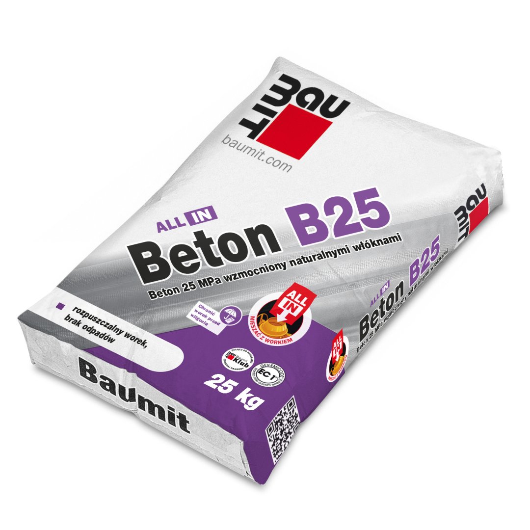 Wśród betonów Baumit szczególną uwagę zwraca innowacyjny produkt ALL IN Beton B25 – jedyny tego typu na rynku. Jego unikalność polega na zastosowaniu rozpuszczalnego worka, który podczas mieszania całkowicie integruje się z zaprawą. To nie tylko wygodne, ale i przełomowe rozwiązanie, które wpływa pozytywnie na właściwości techniczne betonu i jednocześnie eliminuje problem odpadów po opakowaniach.